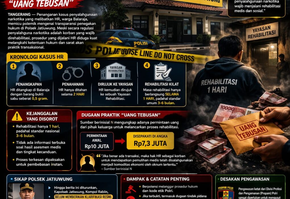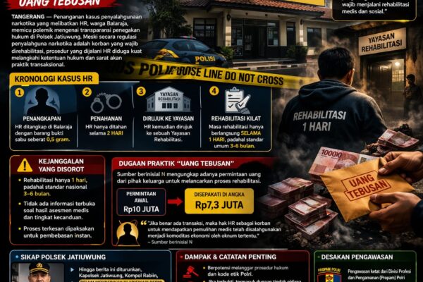 SUARAGEMPUR.COM| TANGERANG — Penanganan kasus penyalahgunaan narkotika yang melibatkan HR, warga Balaraja, memicu polemik mengenai transparansi penegakan hukum di Polsek Jatiuwung. Meski secara regulasi penyalahguna narkotika adalah korban yang wajib direhabilitasi, prosedur yang dijalani HR diduga kuat melangkahi ketentuan hukum dan sarat akan praktik transaksional, Selasa (31/3/2026). Jika merujuk pada Pasal 54 UU Narkotika, pecandu…