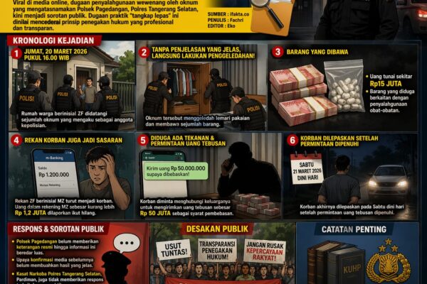 SUARAGEMPUR.COM | TANGERANG SELATAN – Isu dugaan praktik penyalahgunaan wewenang oleh aparat kepolisian kembali menjadi sorotan publik. Informasi yang beredar luas, dan telah tayang di salah satu media online, menyebut adanya dugaan tindakan “tangkap lepas” yang melibatkan oknum yang mengatasnamakan Polsek Pagedangan, Polres Tangerang Selatan, pada Sabtu (18/4/2026). Berdasarkan informasi yang dihimpun dari pemberitaan yang…