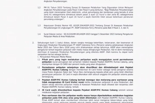 SUARAGEMPUR.COM | BAKAUHENI– Surat pengaturan peliputan media yang dikeluarkan PT ASDP Indonesia Ferry (Persero) Cabang Bakauheni menuai sorotan publik. Kebijakan yang mengatur secara ketat aktivitas jurnalistik di kawasan Pelabuhan Bakauheni tersebut dinilai berpotensi bertentangan dengan Undang-Undang Nomor 40 Tahun 1999 tentang Pers, jum’at (19/12/2025). Surat bernomor HM.001/01017/X/ASDP-CUB/2025 tertanggal 12 Desember 2025 itu memuat sejumlah ketentuan,…