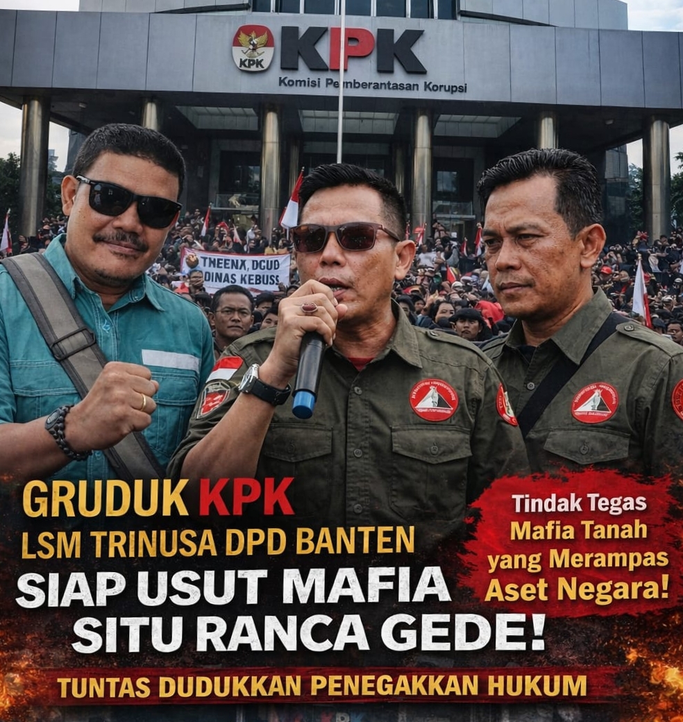 SUARAGEMPUR.COM| JAKARTA – Dewan Pimpinan Daerah (DPD) LSM Triga Nusantara Indonesia Banten dijadwalkan menggelar aksi unjuk rasa di depan kantor Komisi Pemberantasan Korupsi pada 21 April 2026. Aksi ini merupakan bentuk tekanan publik agar aparat penegak hukum segera mengusut dugaan praktik mafia tanah dan penguasaan aset negara di kawasan Situ Ranca Gede, Banten, Senin(20/4/2026).