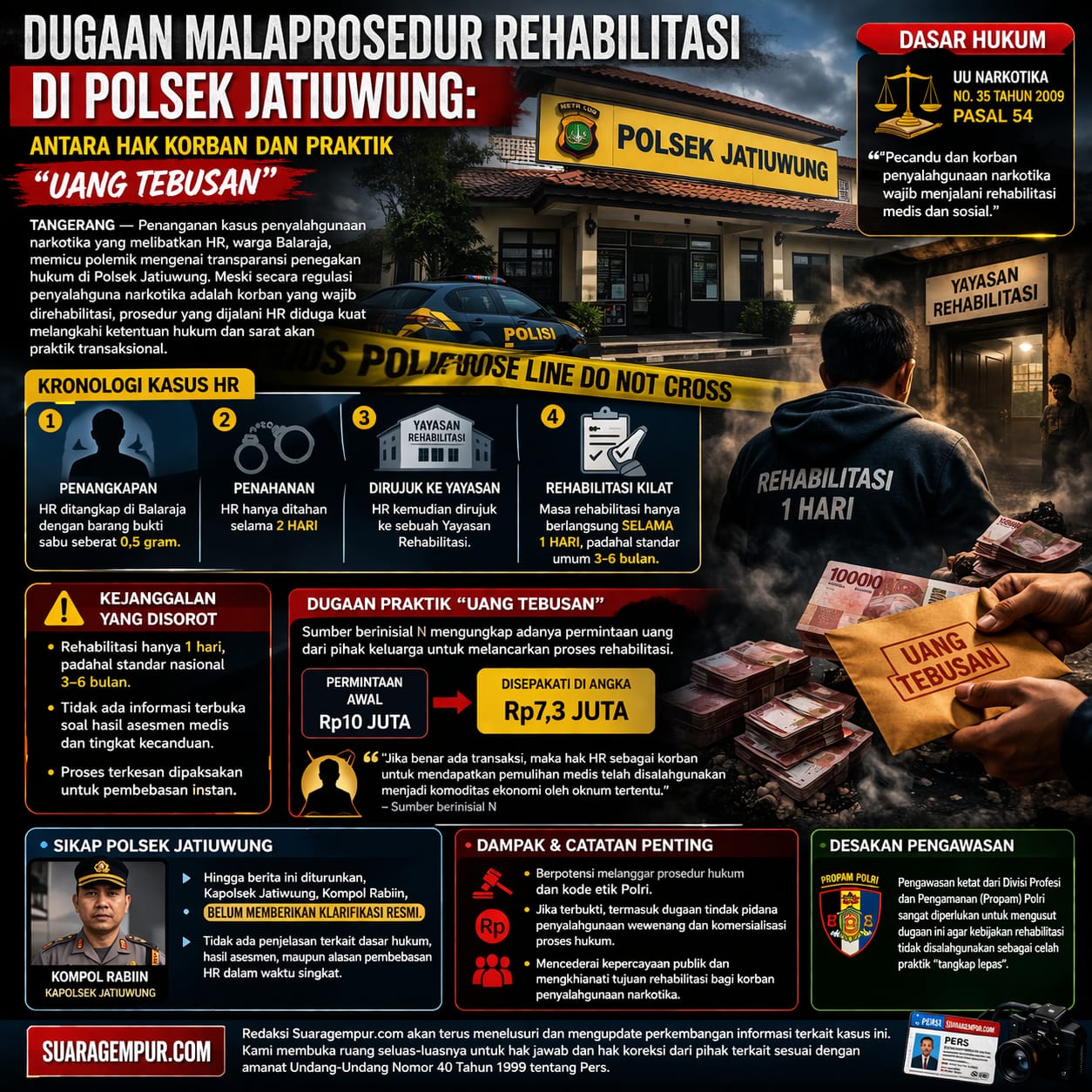SUARAGEMPUR.COM| TANGERANG — Penanganan kasus penyalahgunaan narkotika yang melibatkan HR, warga Balaraja, memicu polemik mengenai transparansi penegakan hukum di Polsek Jatiuwung. Meski secara regulasi penyalahguna narkotika adalah korban yang wajib direhabilitasi, prosedur yang dijalani HR diduga kuat melangkahi ketentuan hukum dan sarat akan praktik transaksional, Selasa (31/3/2026).