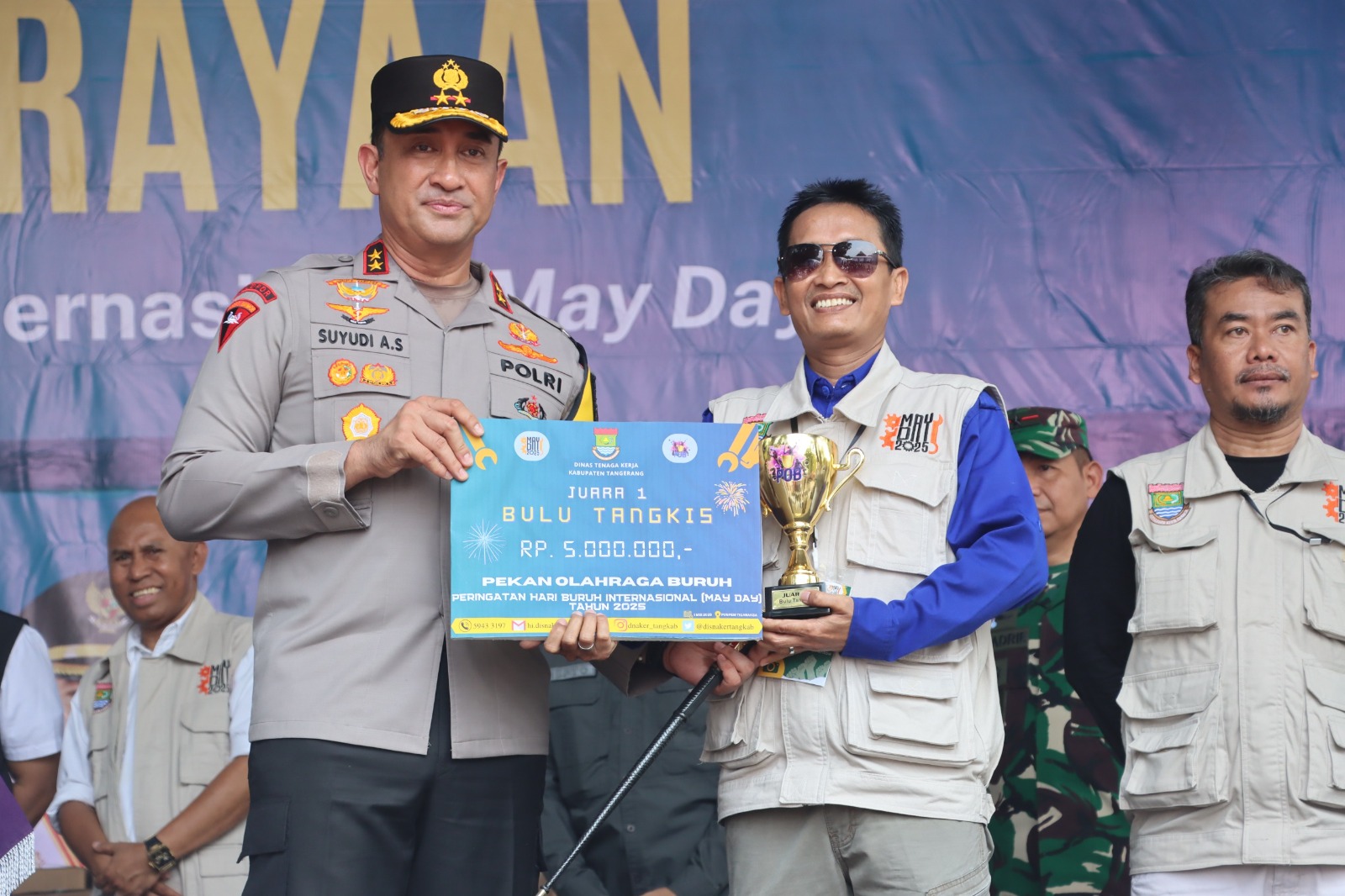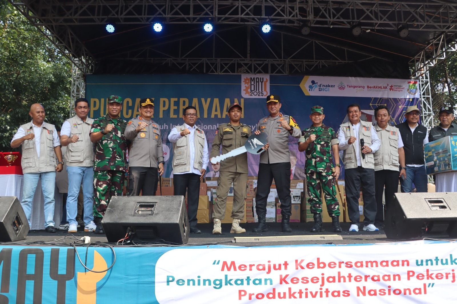 Kapolresta Tangerang Kombes Pol. Baktiar Joko Mujiono, S.I.K., M.M. mendampingi Kapolda Banten Irjen Pol. Suyudi Ario Seto, S.H., S.I.K., M.Si. dalam acara yang bertujuan mempererat solidaritas dan kolaborasi antara pekerja, pengusaha, dan pemerintah. Bupati Tangerang Moch Maesyal Rasyid selaku penanggung jawab acara turut memastikan kelancaran acara yang berlangsung dari pagi hingga sore hari.