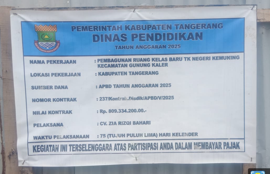 SUARAGEMPUR.COM | Kabupaten Tangerang — Proyek pembangunan Ruang Kelas Baru (RKB) di TK Negeri Kemuning, Kecamatan Gunung Kaler, Kabupaten Tangerang, kembali menjadi sorotan publik terhadap tata kelola proyek pendidikan. Pembangunan yang menghabiskan dana APBD sebesar Rp.809.334.200 dari Tahun Anggaran 2025 ini memunculkan kekhawatiran serius terkait mutu material yang digunakan, khususnya penggunaan besi tulangan yang diduga kuat tidak sesuai dengan standar nasional.