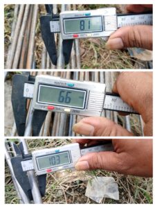 Dugaan ini bukan tanpa dasar. Hasil pengamatan di lapangan pada Senin 14 Juli 2025, menunjukkan bahwa material besi yang digunakan memiliki ukuran yang jauh dari spesifikasi dalam Rencana Anggaran Biaya (RAB). Bahkan, temuan di lokasi memperlihatkan bahwa besi yang seharusnya berdiameter 13mm, 10mm, dan 8mm, ternyata hanya berukuran masing-masing 10,4mm, 8,1mm, dan 6,6mm. Angka-angka ini jauh di bawah toleransi diameter yang diizinkan SNI 2052:2017, yaitu ±0,4mm untuk diameter 8mm hingga 14mm, dan ±0,3mm untuk diameter 6mm.