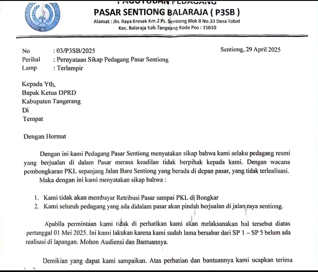 SUARAGEMPUR.COM – Kabupaten Tangerang – 30 April 2025, Puluhan pedagang resmi yang berjualan di dalam Pasar Sentiong, Desa Tobat, Kecamatan Balaraja, Kabupaten Tangerang, menyatakan sikap protes terhadap kebijakan pemerintah daerah yang dinilai tidak adil. Melalui surat resmi yang ditujukan kepada Ketua DPRD Kabupaten Tangerang, para pedagang menolak untuk membayar retribusi pasar jika pedagang kaki lima (PKL) yang berjualan di sepanjang Jalan Baru Sentiong tidak segera ditertibkan.