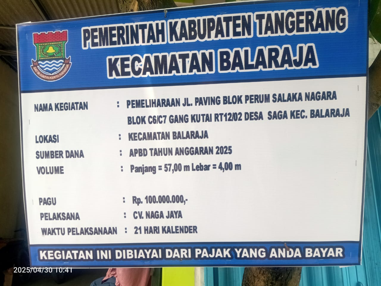 SUARAGEMPUR.COM | Kabupaten Tangerang — Proyek pemeliharaan jalan paving blok di Perumahan Salaka Nagara, RT 12/02, Desa Saga, Kecamatan Balaraja, Kabupaten Tangerang, kembali menuai sorotan tajam. Proyek yang menelan anggaran sebesar Rp100 juta dari APBD Tahun 2025 ini diduga kuat menyimpan berbagai penyimpangan, mulai dari metode kerja yang tidak sesuai spesifikasi hingga lemahnya pengawasan teknis di lapangan. Rabu (30/04/2025)