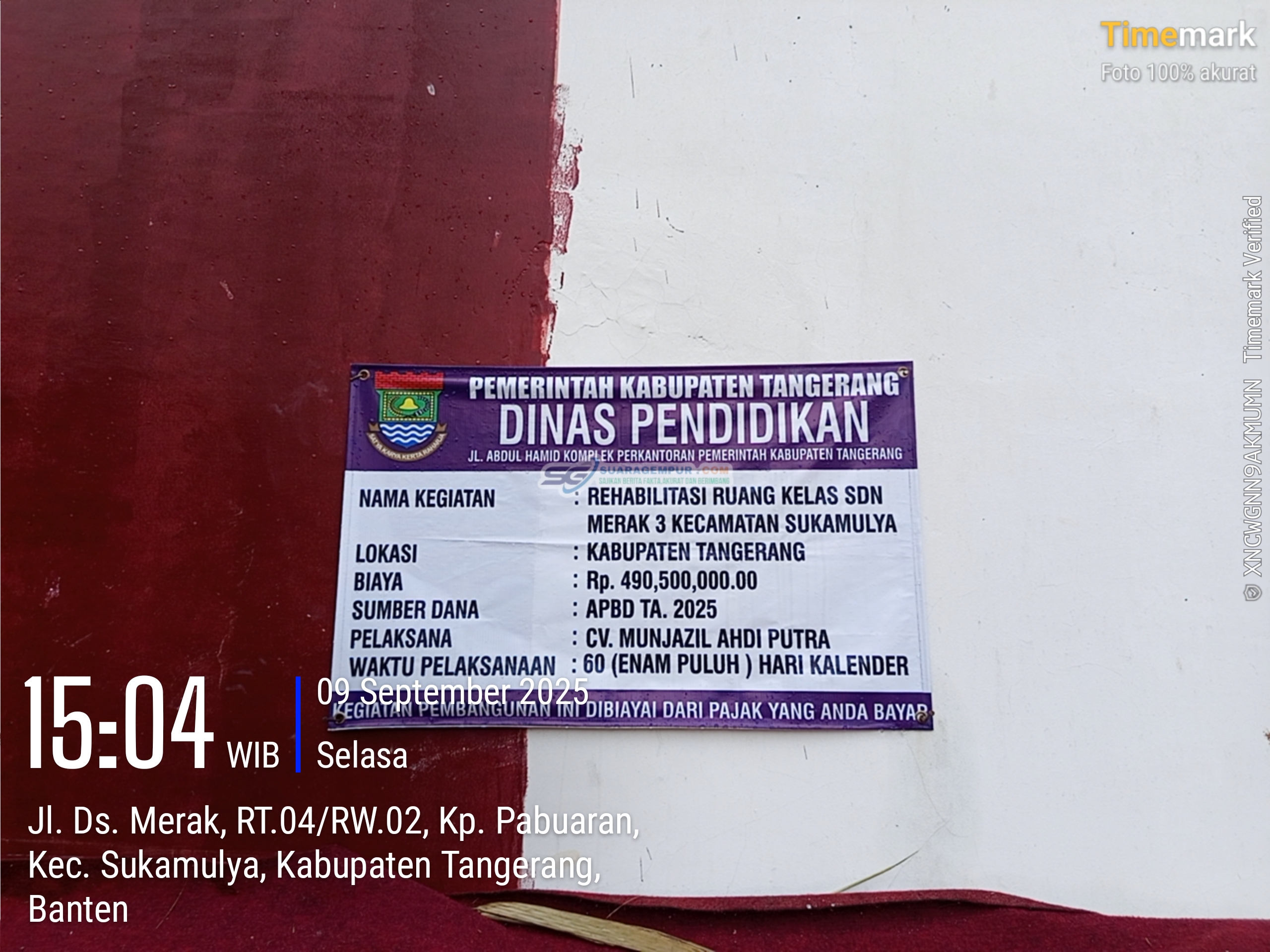 Menurut Papan informasi di lokasi, proyek yang dikerjakan oleh CV. Munjazil Adhi Putra ini memiliki nilai kontrak sebesar Rp 490.500.000 dari Anggaran Pendapatan dan Belanja Daerah (APBD) Tahun Anggaran 2025. Salah seorang pekerja bernama Utap menjelaskan bahwa luas bangunan ruang kelas yang direhab adalah 9 x 8 meter persegi, dengan fokus pekerjaan meliputi pergantian genting, rangka atap, plafon, pengecatan dinding, pergantian kusen jendela, pemasangan lisplang, dan plester ringan.